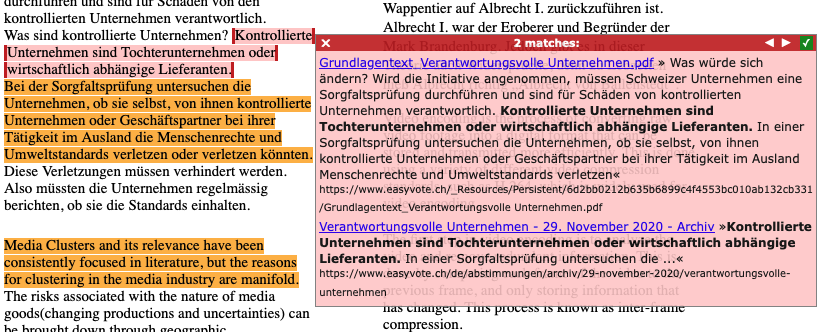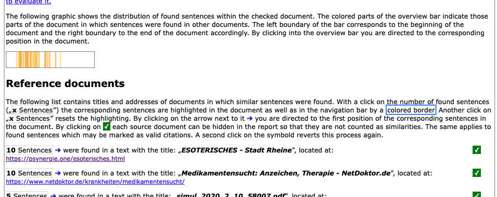 Any source in the list of reference documents can be hidden. There is a symbol ✓ to the right of each source document for this purpose. Clicking this symbol causes the entry in the list of reference documents to be grayed out and this source to be hidden from the list. Found sentences that then solely contain matches with hidden source documents are also hidden and highlighted in light green in the navigation bar as well as in the text. Another click on ✓ cancels the hiding of the source.