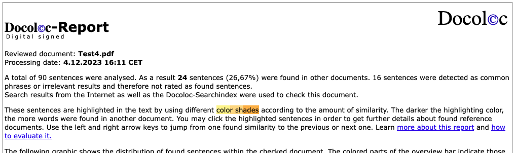 The Docol©c-Report is the result of a plagiarism check of a document with Docol©c and contains all similarities found. In the following, we give detailed information about the structure of the report and describe the navigation within the report. Information about the interpretation of the report can be found on a separate page.