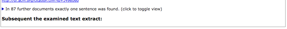 Docol©c detects sentences as common phrases, if they can be found in a large number of other documents. This may be commonly used phrase like "The rest of this document is organized as follows." or sentences giving some well-known facts, such as "Johann Wolfgang von Goethe was born on 28 of August 1749 in Frankfurt am Main." If you have activated filtering in the configuration of your account, results which are found in several sources are ignored as well if no other sentences were found in these source documents. Such results often occur in reference lists and are also counted as irrelevant results.